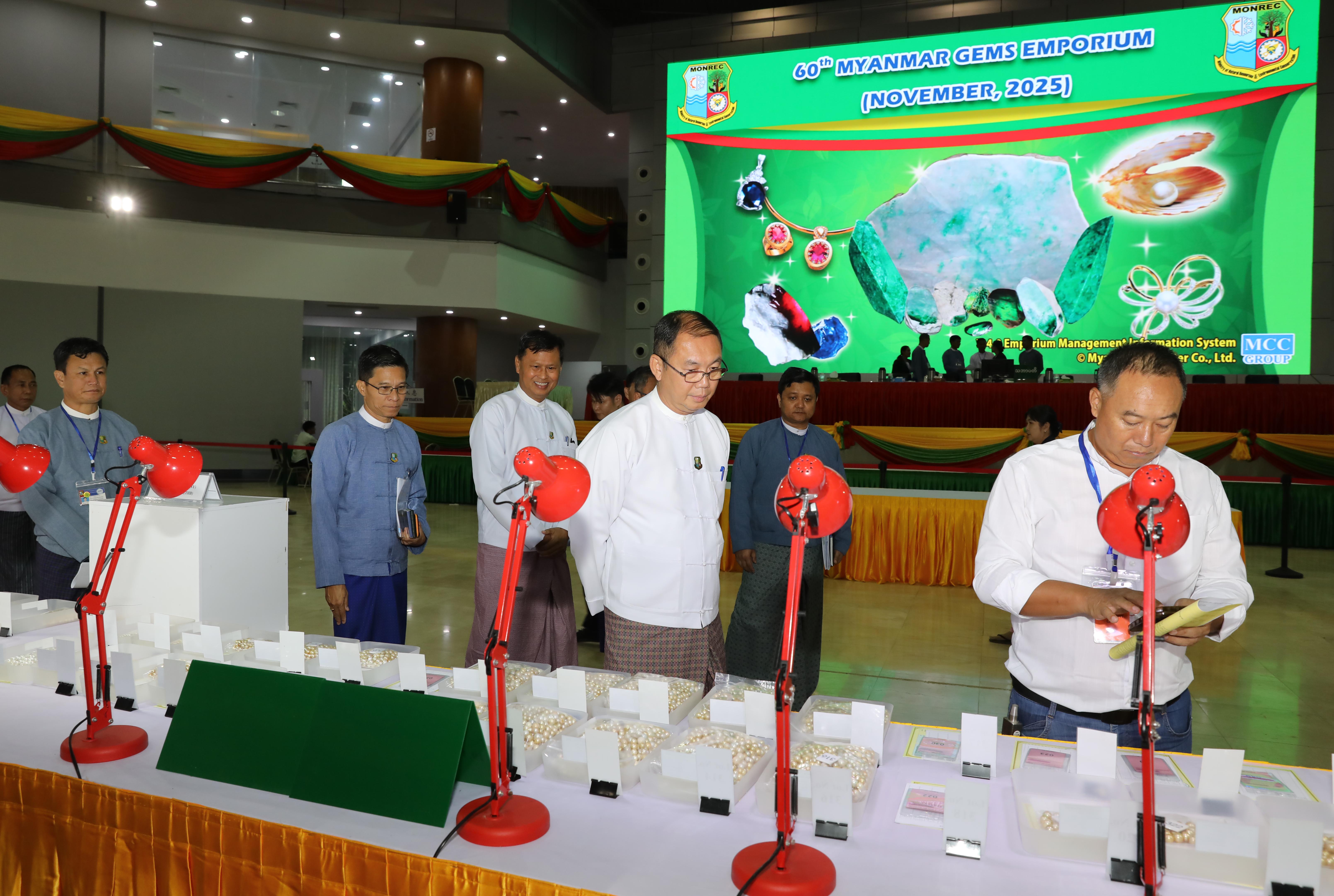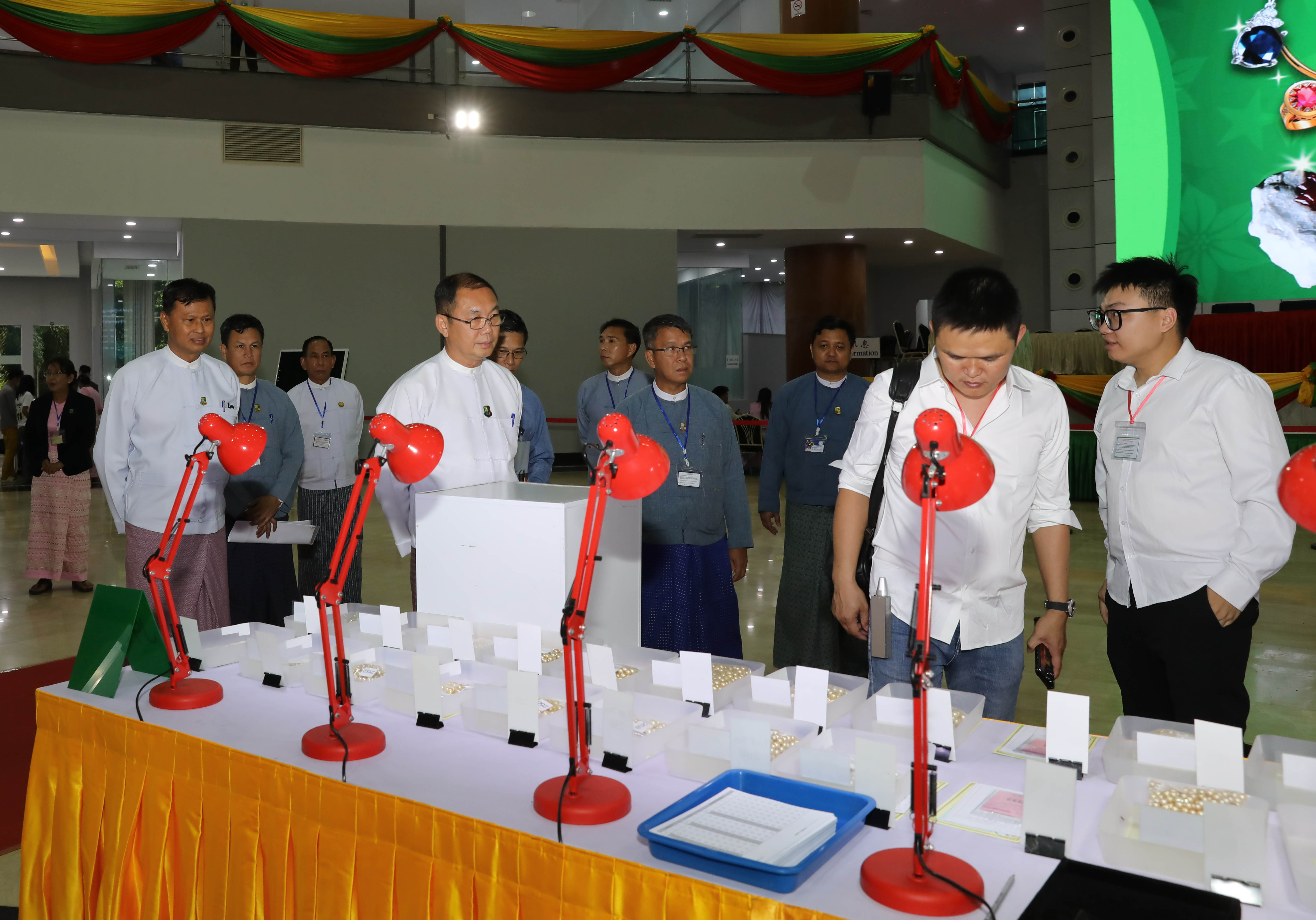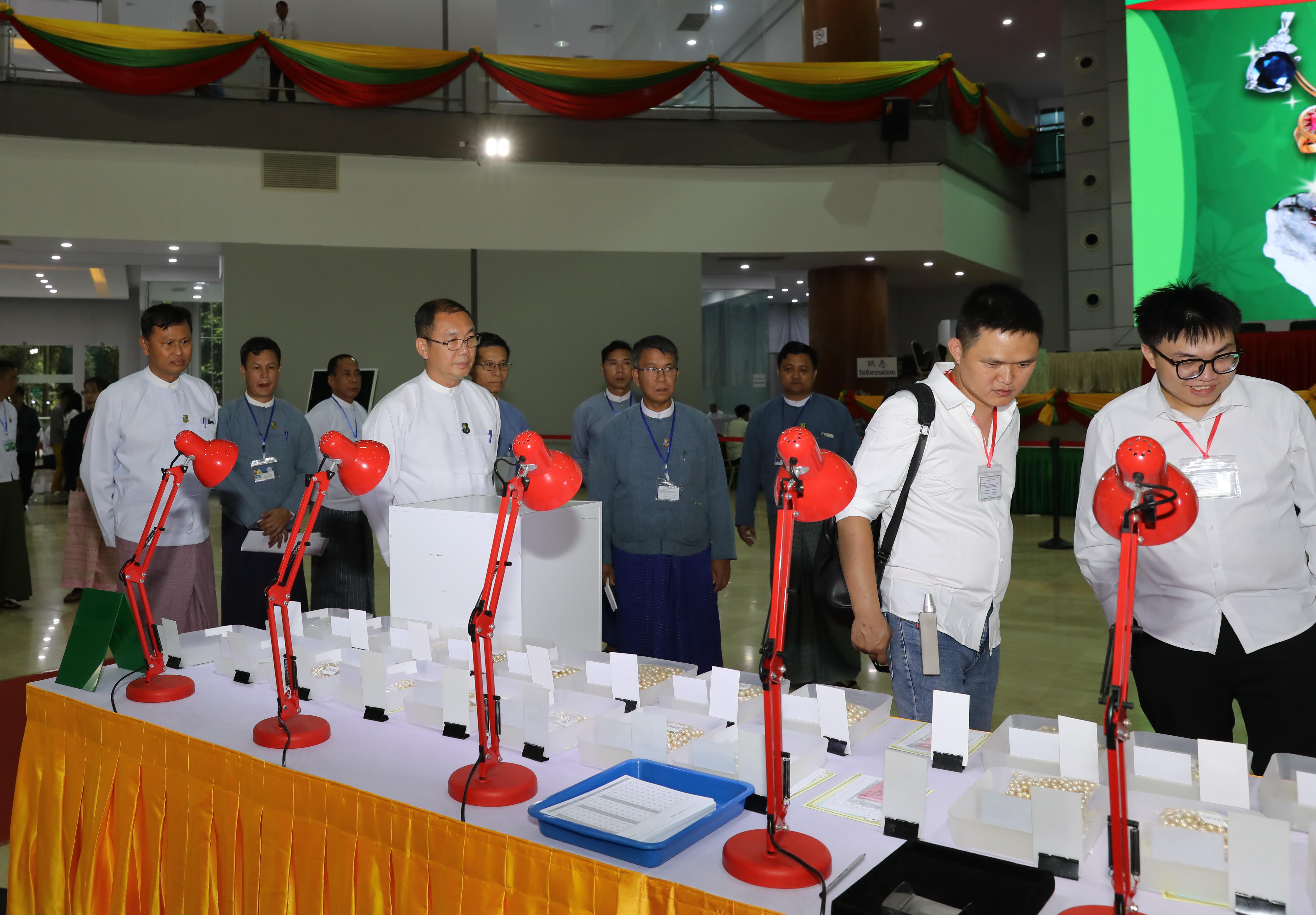 မွန်းလွဲပိုင်းတွင် မြန်မာ့ကျောက်မျက်ရတနာပြပွဲ ဗဟိုကော်မတီ နာယက၊ သယံဇာတနှင့် သဘာဝ ပတ်ဝန်းကျင်ထိန်းသိမ်းရေးဝန်ကြီးဌာန၊ ပြည်ထောင်စုဝန်ကြီး ဦးခင်မောင်ရီသည် ပြပွဲကျင်းပရာ မဏိရတနာ ကျောက်စိမ်းခန်းမ၌ ပုလဲအတွဲများ တင်ဒါဖွင့်ဖောက်စစ်ဆေး၍ ရောင်းချနေမှု၊ မဏိရတနာကျောက်စိမ်းခန်းမ အတွင်း ပြသထားသည့် ပုလဲအတွဲများ၊ ကျောက်စိမ်းအတွဲများ၊ ကျောက်မျက်အတွဲများ၊ ကျောက်မျက်နှင့် လက်ဝတ်ရတနာအရောင်းဆိုင်များကို လိုက်လံကြည့်ရှုစစ်ဆေးပြီး လိုအပ်သည်များကို တာဝန်ရှိသူများအား မှာကြားသည်။